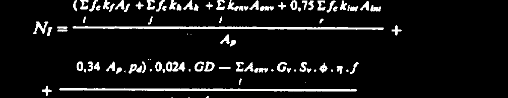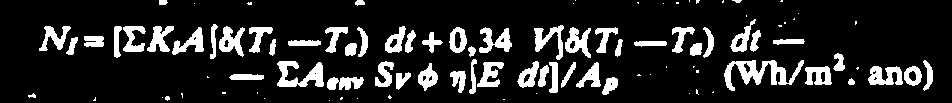 —factor de utilização dos ganhos solares, que traduz o facto de que nem toda a energia solar que entra no edifício é utilizável em termos de conforto, traduzindo-se por vezes em sobreaquecimento do ar interior. Este factor aumenta com a inércia da construção e diminui com o aumento da relação ganhos/necessidades brutas de aquecimento (v fig. IV.2).As necessidades nominais de energia útil, NI, por estação de aquecimento, por metro quadro de área útil de pavimento, são então calculadas pelo integral da soma algébrica dos valores instantâneos de Q1, Q2 e Q3 ao longo de toda a estação de aquecimento dividido pela área útil do pavimento Ap: