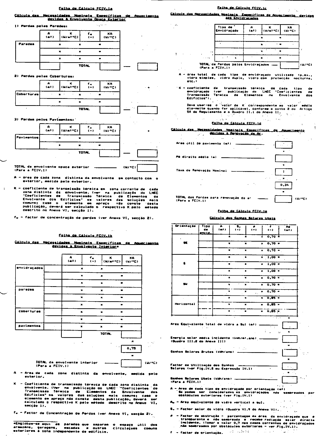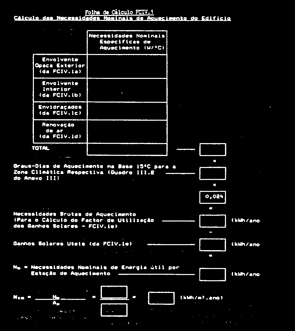 A folha de cálculo FCIV.1 estabelece o cálculo do valor das necessidades nominais de energia útil para aquecimento correspondente à solução projectada, de acordo com a metodologia descrita na primeira parte deste anexo. O seu preenchimento faz chamada a cinco folhas de cálculo parcelares, FCIV.1a a FVIC.1e, que servem para calcular, respectivamente, as perdas correspondentes à envolvente opaca exterior, à envolvente interior, aos envidraçados e à renovação do ar e os ganhos solares úteis. A folha de calculo FCIV.1 soma as perdas e deduz-lhes o valor dos ganhos solares, calculado na folha de cálculo FCIV.1e, resultando o valor de Nic.