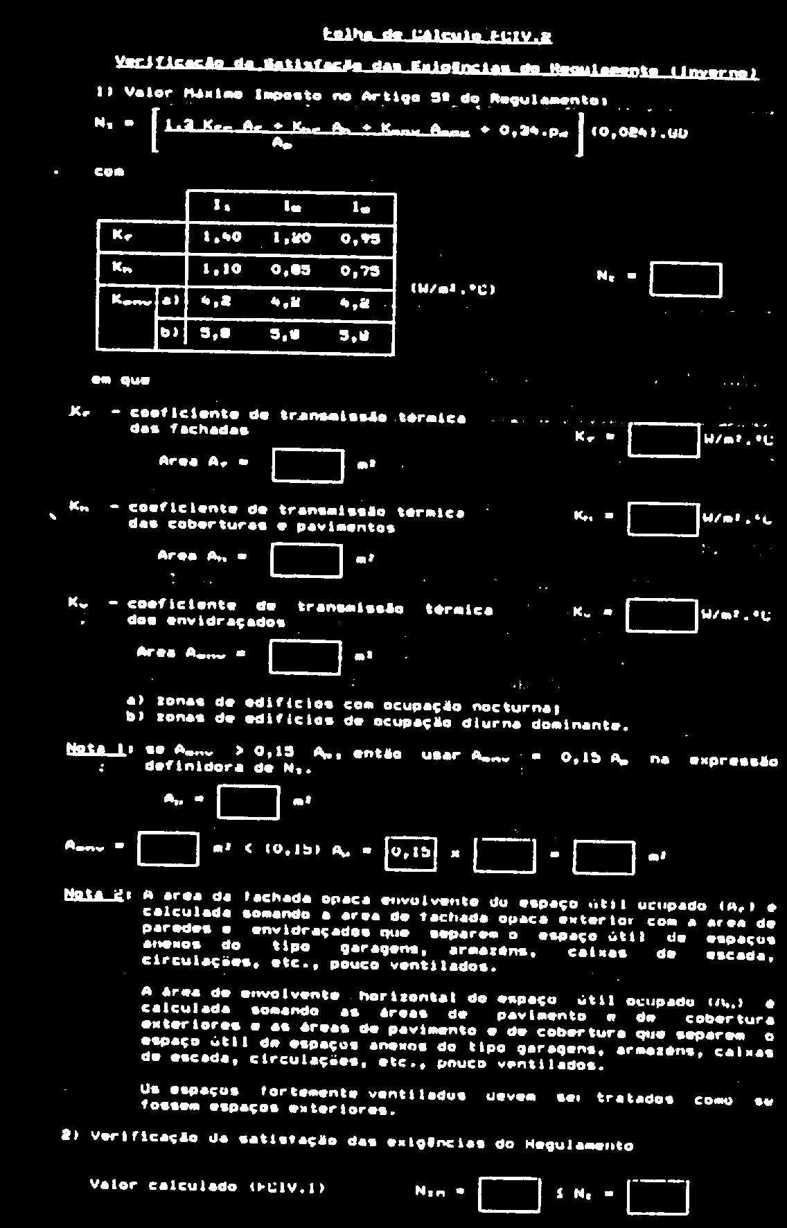A verificação da situação das exigências do Regulamento sob o ponto de vista de Verão pode ser feita mediante o preenchimento da folha de cálculo FCV.2, onde o valor máximo regulamentar, Nv, conforme expressão constante do n.° 2 do artigo 6.º do Regulamento é comparado com o valor calculado na folha de cálculo FCV I, Nvc.