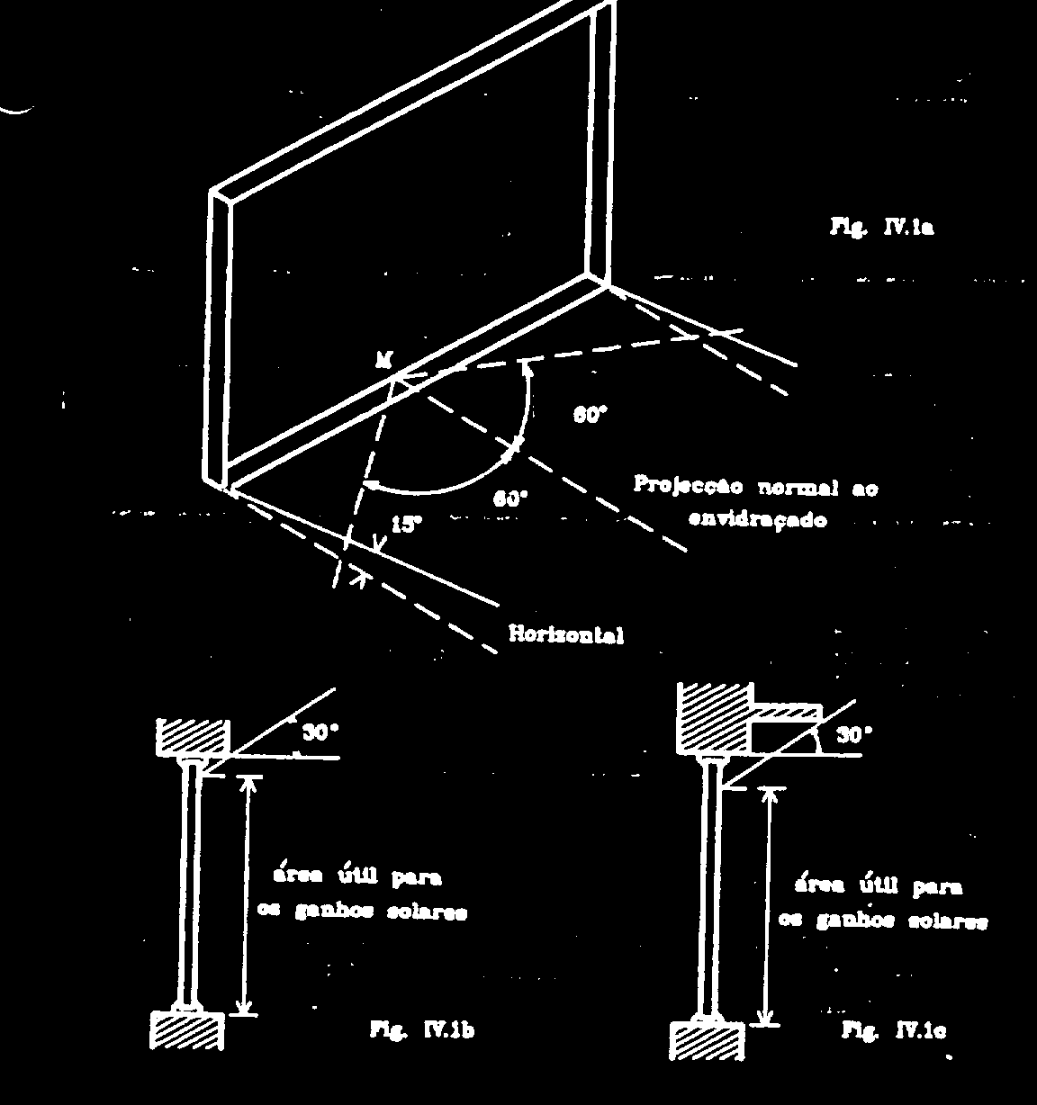 Nota 2—Só deve ser considerada para efeitos de ganhos solares a área envidraçada que e insolada quando o sol incide de frente e está a uma altura de 30°, como se mostra nas figs. IV.1b e IV.1c.
