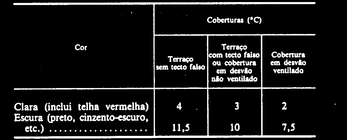 b) Coberturas exteriores.—A formulação é idêntica à usada para as paredes, mas DTe é agora função do tipo de cobertura e da sua cor, tal como indicado no quadro v.3.